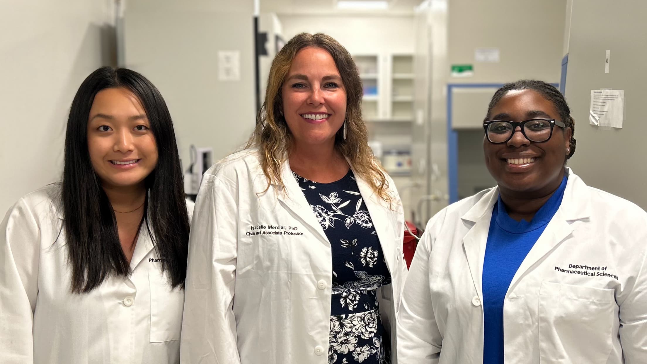 Left to right: Jennifer Nguyen, pharmacology and toxicology PhD candidate; Isabelle Mercier, PhD, chair of the Department of Pharmaceutical Sciences; and Caitlyn Ulmer ’24, pharmacology and toxicology major